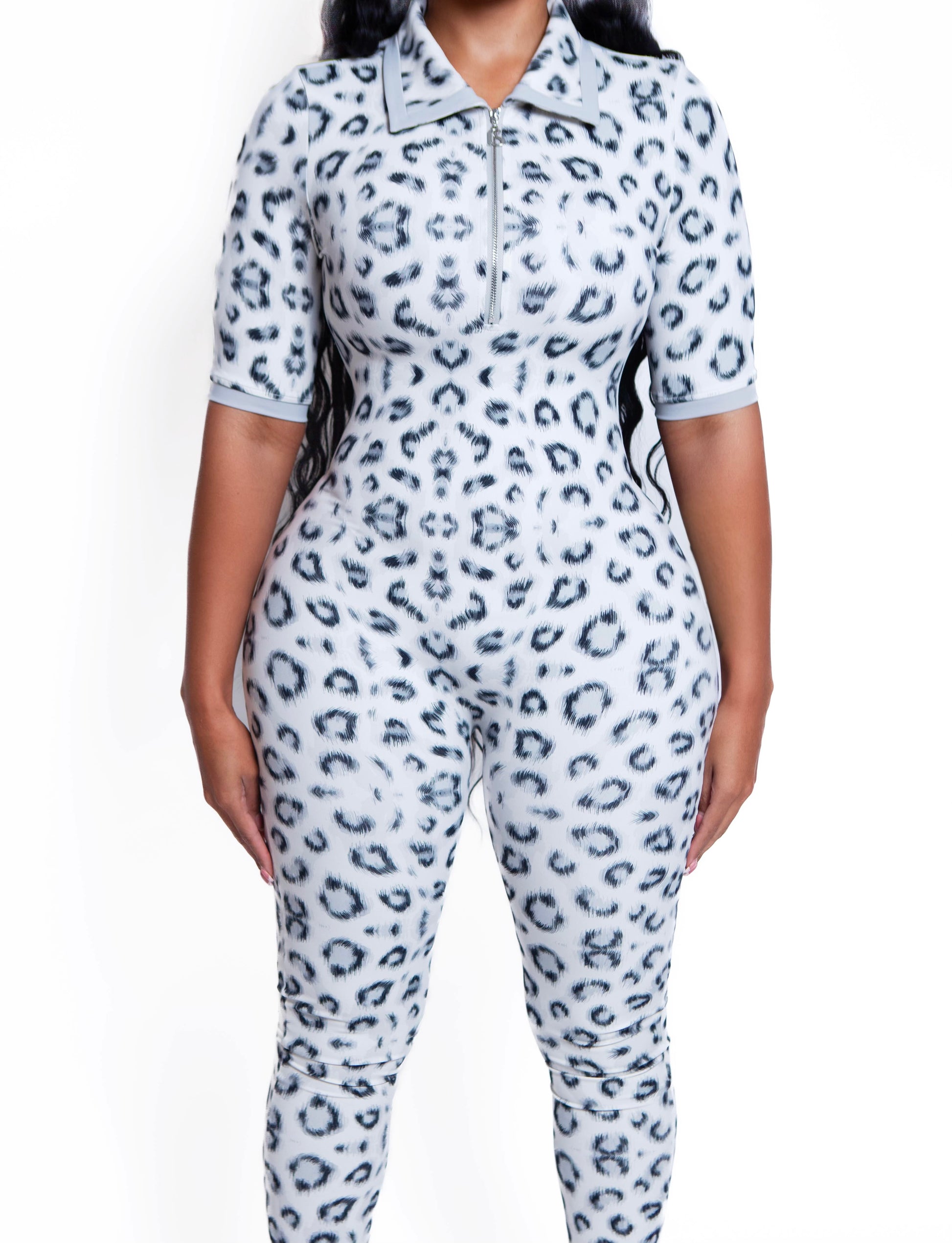 Unleash your inner Cheetah Doll with this sleek short sleeve jumpsuit. Designed with a deep V zipper front and curve-hugging stretch, this look is perfect for running errands or turning heads at brunch. Slip it on, zip it up, and own the day like the bold active doll you are.